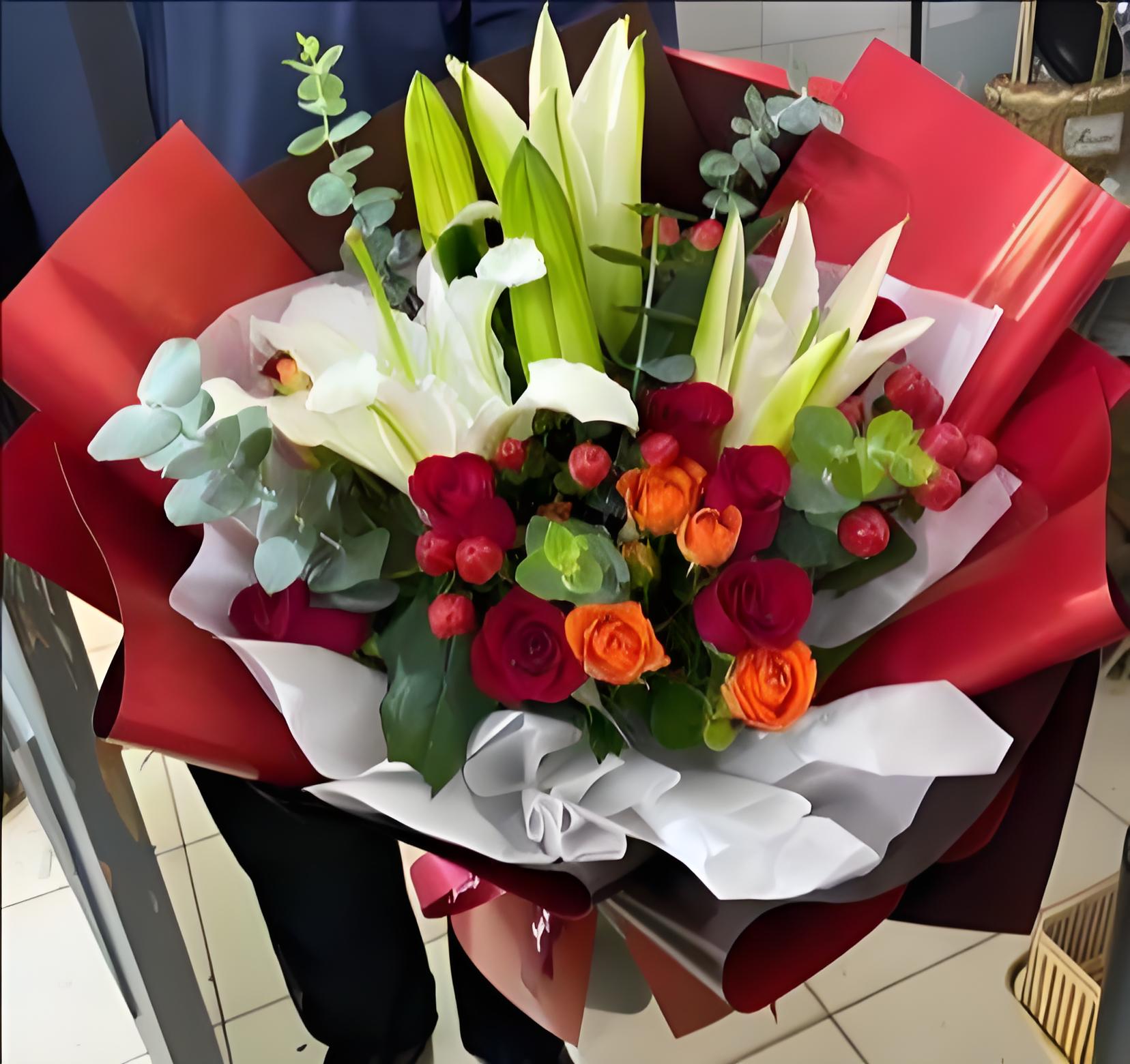 大理州大理市花店包11枝红玫瑰、2枝多头白百合、6枝橙色多头玫瑰、红豆、尤加利叶
